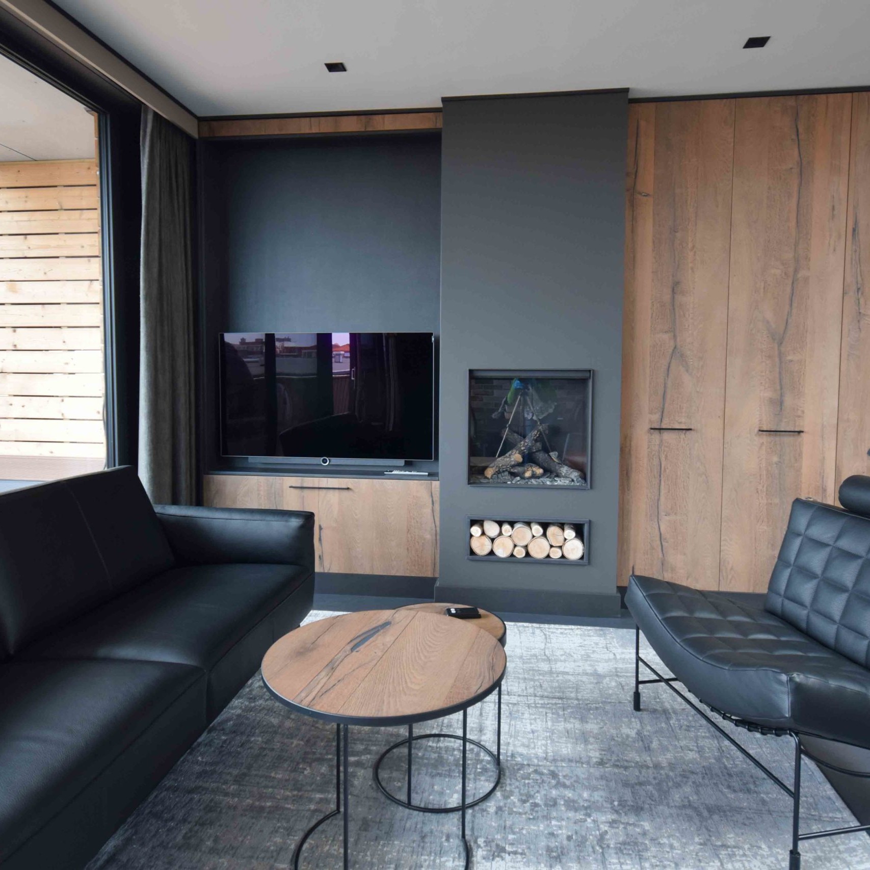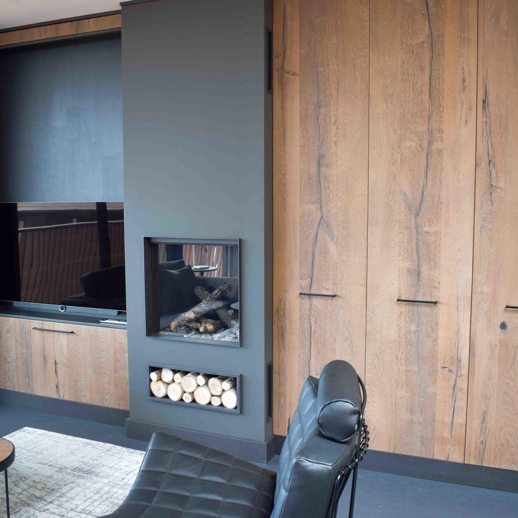 Voor de inrichting van dit appartement hebben we een kastenwand op maat ontworpen, met een nis voor de televisie, ruimte voor de gordijnen en een open haard.